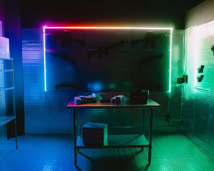1,500+ SQF production MULTI-SET ROOM in DTLA. ABOUT THE MULTI-SET • Casino with slots, Blackjack table, bar area • Armory with prop guns and money • Frosted Glass Hallway • LED Chain/Caution Tape Hallway • LED Triangle • Los Angeles Mural • Magazine Collage Wall • 2 softbox lights • Perfect for music videos, movies, special celebrations, and photoshoots